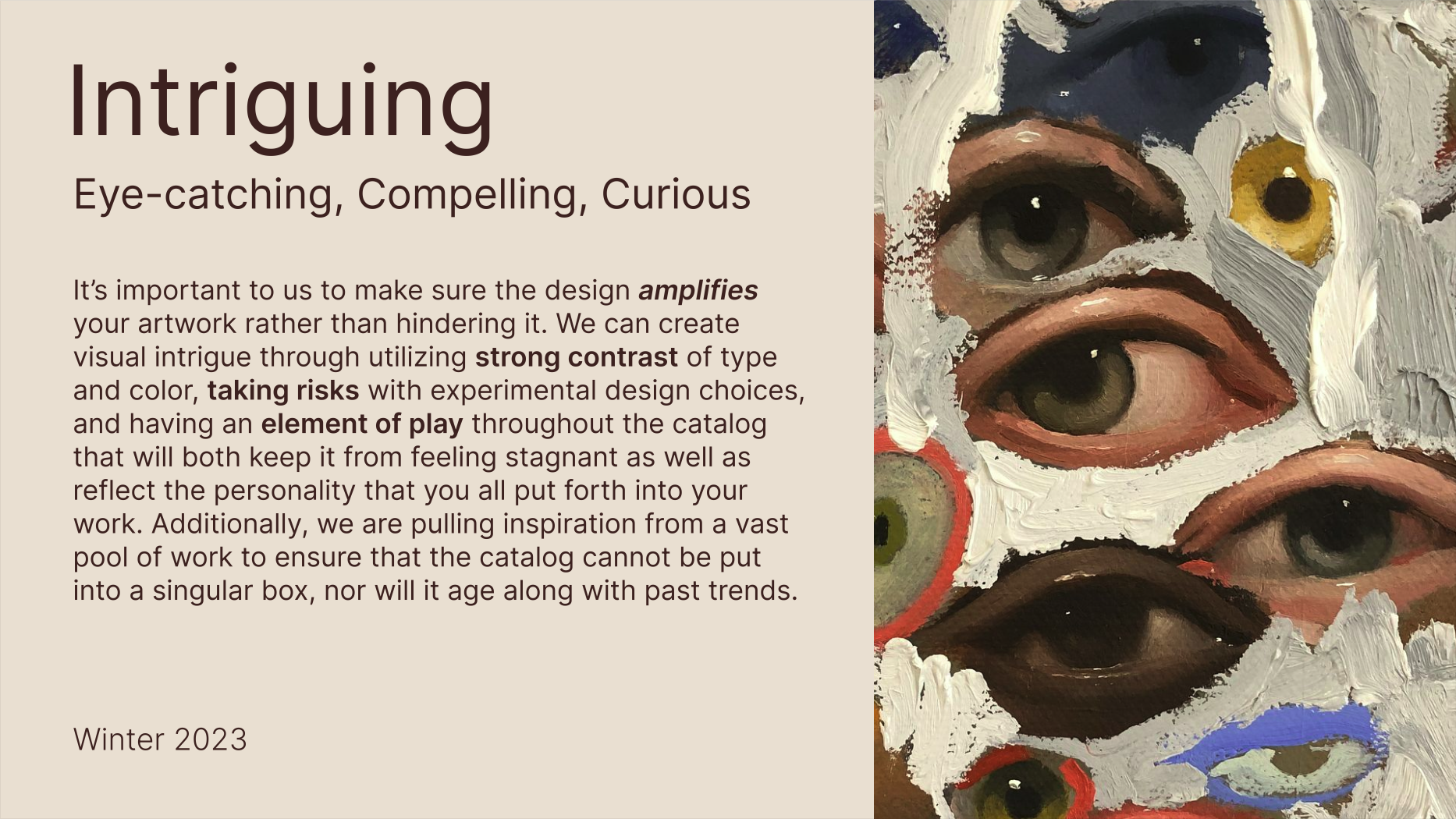 A catalog for the Graduation Exhibition for BFA/MFA Art Practices Students at PSU. This catalog features each graduating artist, with the goal of both highlighting their individual work while forming a cohesive, professional, intriguing, and balanced design. We tied together timeless, polished typefaces with slightly off-kilter layouts, introducing atypical movement to each page to marry the concepts of curiosity and sophistication.